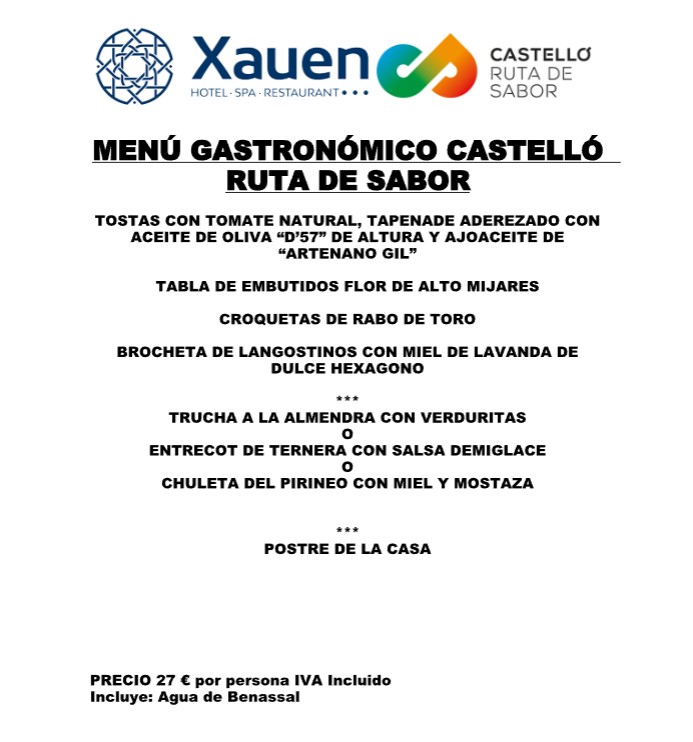 Cartas y menús Descubre las distintas cartas y menús del Hotel Xauen CARTA RESTAURANTE Menú DEGUSTACIÓN CARTA CAFETERÍA CARTA AVENIDA Carta Restaurante Menú degustación Carta cafetería Carta Avenida SPA en Montanejos – Hotel XauenRelajarse nunca supo tan bien. ¡Llámanos! reserva ahora +34 964 131 151